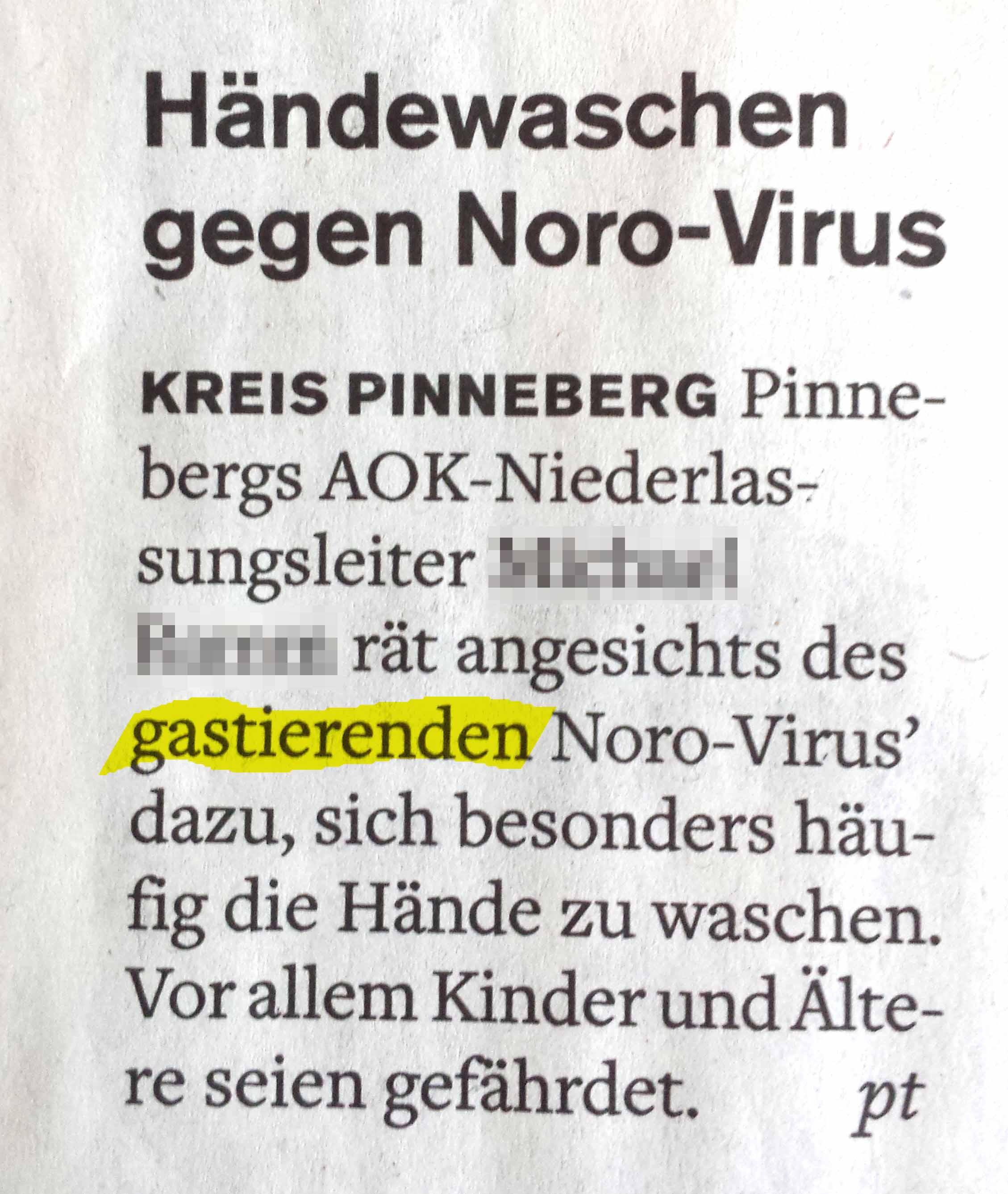 Aufgrund des großen Erfolges beschloss das Noro-Virus, sein Gastspiel im Kreis Pinnberg zu verlängern. Aus den „Elmshorner Nachrichten“ vom 11.11.2016, eingeschickt von Alexandra Hillringhaus Zum nächsten Fundstück: Munition für Abc-Schützen