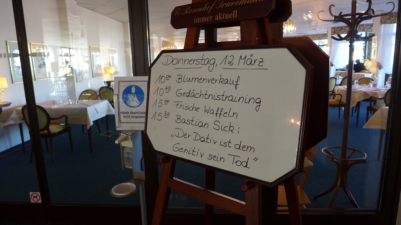 Heute Nachmittag habe ich in der Seniorenresidenz „Rosenhof“ in Travemünde eine Lesung gehalten. Der Vortragssaal war bis auf den letzten Platz besetzt; wie man mir mitteilte, war die Veranstaltung bereits einen Tag nach Bekanntwerden ausverkauft und es gab Wartelisten für eventuelle Restplätze. Ich hatte ein einstündiges Programm vorbereitet mit Geschichten aus meinen „Dativ“-Büchern, mit bunten Bildern und Gedichten. Am Ende gab es als Zugabe ein Lied: „Würde Goethe heut noch leben“.