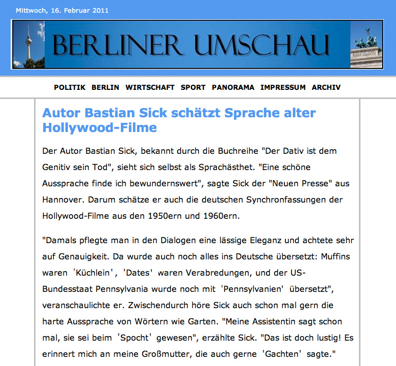 16.02.2011, Berliner Umschau Bastian Sick 16. Februar 2011 Schreiben Sie einen Kommentar 925 Besucher Autor Bastian Sick schätzt Sprache alter Hollywood-Filme Teilen Facebook Twitter