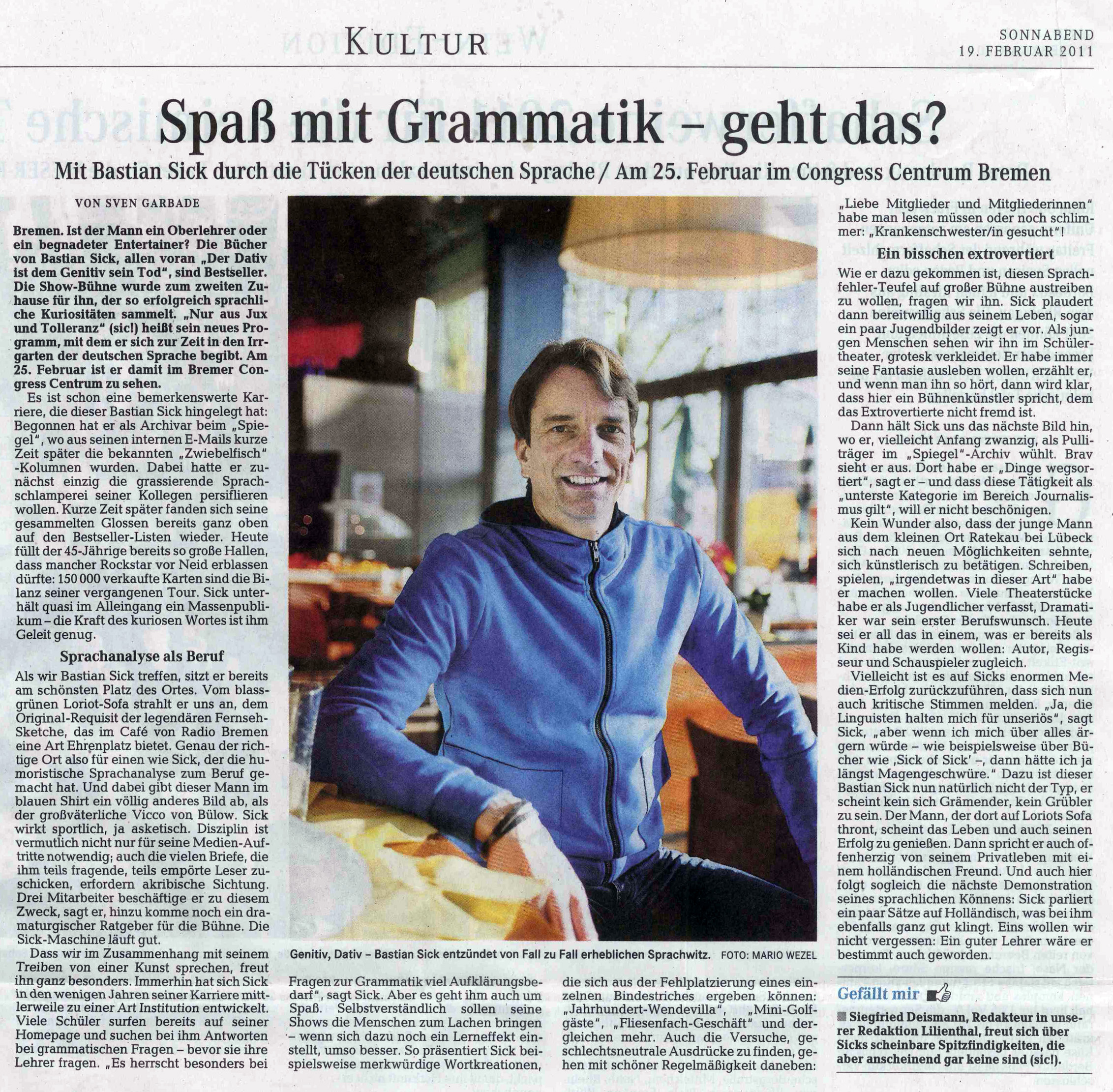 19.02.2011, Weser Kurier Bastian Sick 19. Februar 2011 Schreiben Sie einen Kommentar 948 Besucher Spaß mit Grammatik – geht das? Teilen Facebook Twitter